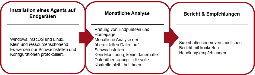 Mit dem CyRiSo-Agent führen wir monatlich einen Systemcheck Ihrer Endgeräte und Ihrer Homepage durch. Dabei werden sicherheitsrelevante Einstellungen, Softwarestände und bekannte Schwachstellen überprüft.